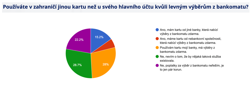 Výběry z bankomatů v zahraničí zdarma přitom zdaleka nejsou tržním standardem — jen čtvrtina lidí tvrdí, že takovou službu jejich banka umí. Ti, kteří se o náklady v zahraničí zajímají, proto často hledají řešení jinde — 21 % lidí si pořídilo speciální kartu v jiné bance nebo fintechové instituci.