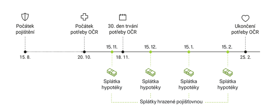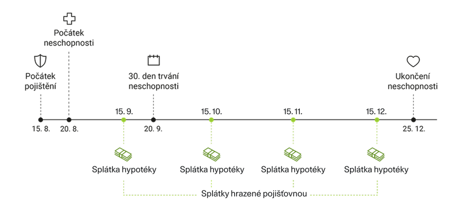 Pokud budete v pracovní neschopnosti déle než 30 dnů, vyplatí vám pojišťovna splátky hypotéky navýšené o poplatek za pojištění zpětně od začátku neschopnosti. Peníze tak dostanete už za první měsíc pracovní neschopnosti.