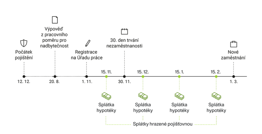 Při nedobrovolné ztrátě zaměstnání trvající déle než 30 dnů ode dne registrace na úřadu práce vám pojišťovna vyplatí splátky hypotéky navýšené o poplatek za pojištění zpětně od začátku vaší nezaměstnanosti. I v tomto případě dostanete peníze už za první měsíc bez zaměstnání.